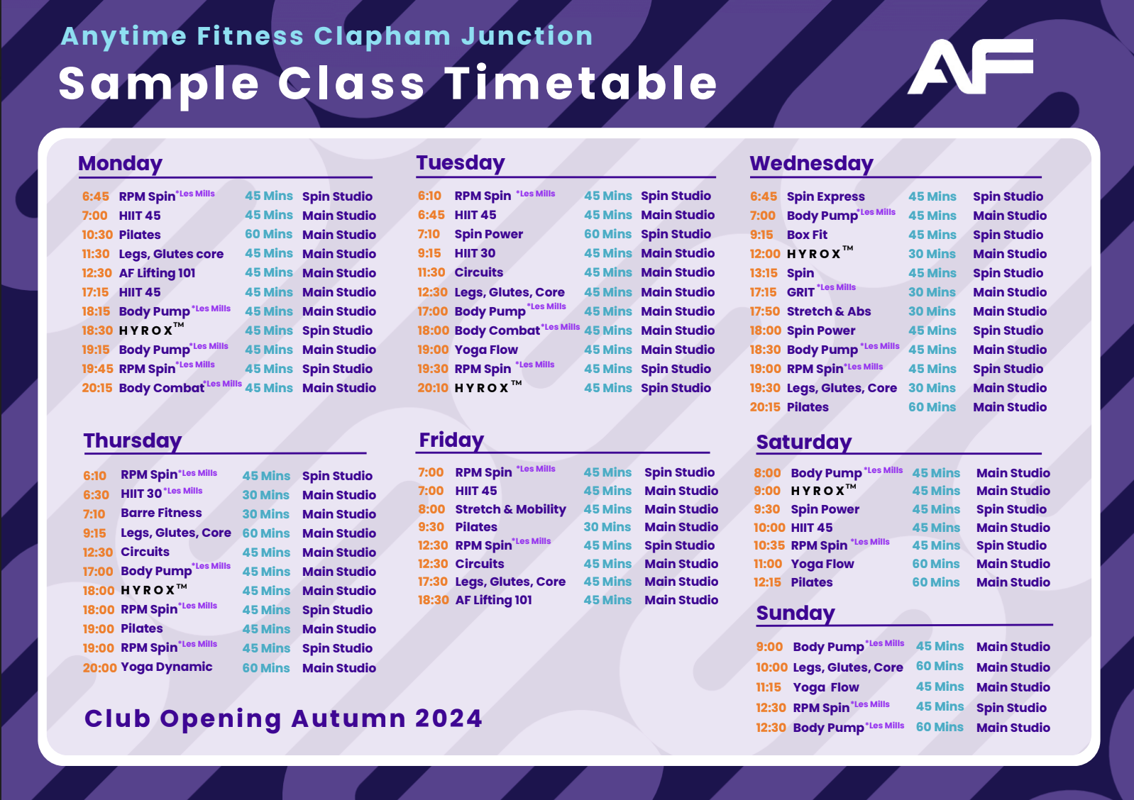 We will have over 80 classes available, all of which can be booked, by home club members only, via the AF App.